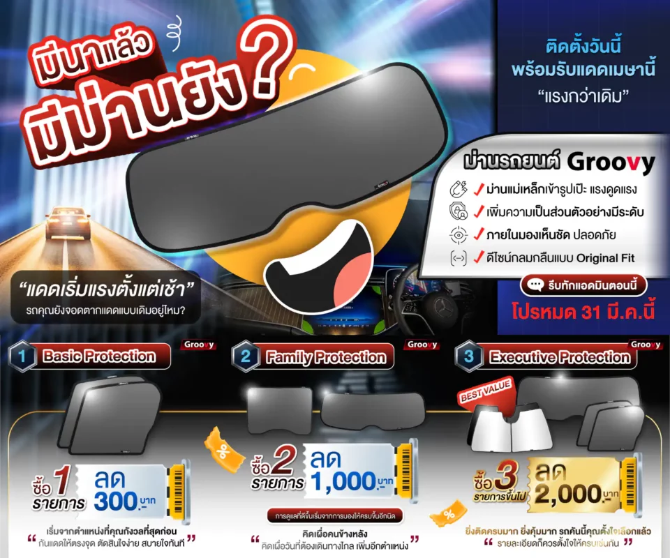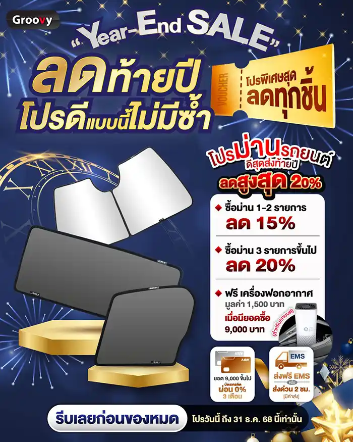 Groovy เป็นแบรนด์ที่มีแบบม่านสำหรับรถยนต์ให้เลือกซื้อมากที่สุดเกือบ 400 รุ่น คลอบคลุมรถในประเทศไทยย้อนหลังไปประมาณ 10 ปี